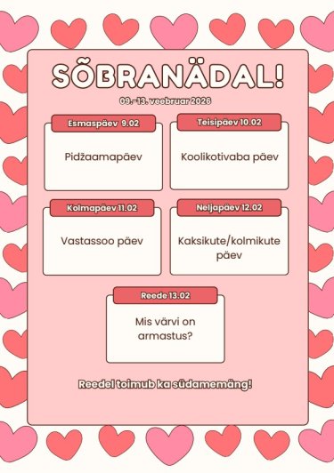 Õpilasesinduse eestvedamisel tähistame koolis sõbrapäeva terve sõbrapäeva (stiili)nädalaga.